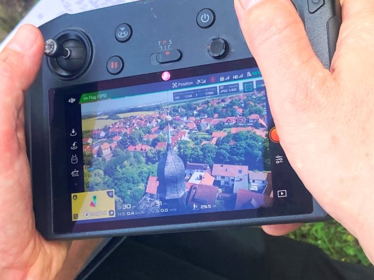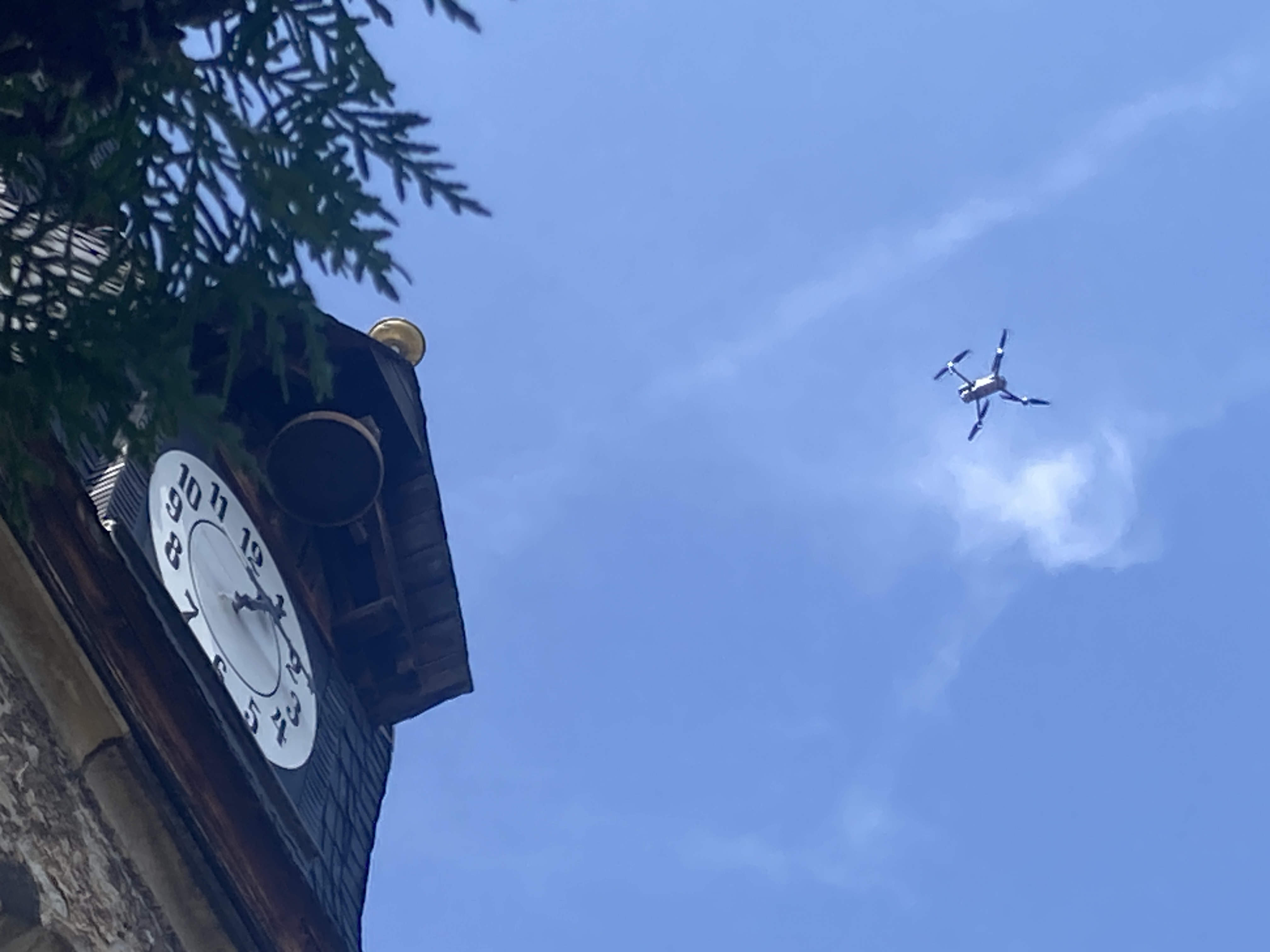 Mit einer Drohnenbefliegung am 3. August 2020 wird die Kirche für künftige Sanierungsvorhaben ausgemessen. Zugleich werden Schäden im Turmbereich aufgenommen.