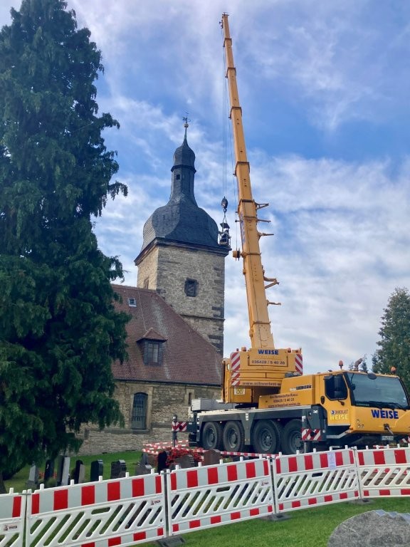 Nachdem der Sturm "Friederike" 2018 die Kirchturmuhr aus der Verankerung gerissen hatte, wurde sie am 13. April 2018 wieder eingebaut.