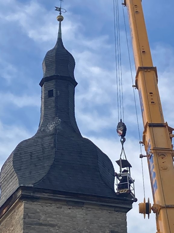 Die Reparatur am Kirchturm erfolgt aus dem Krankorb eines 70-Tonnen-Teleskopkrans.
