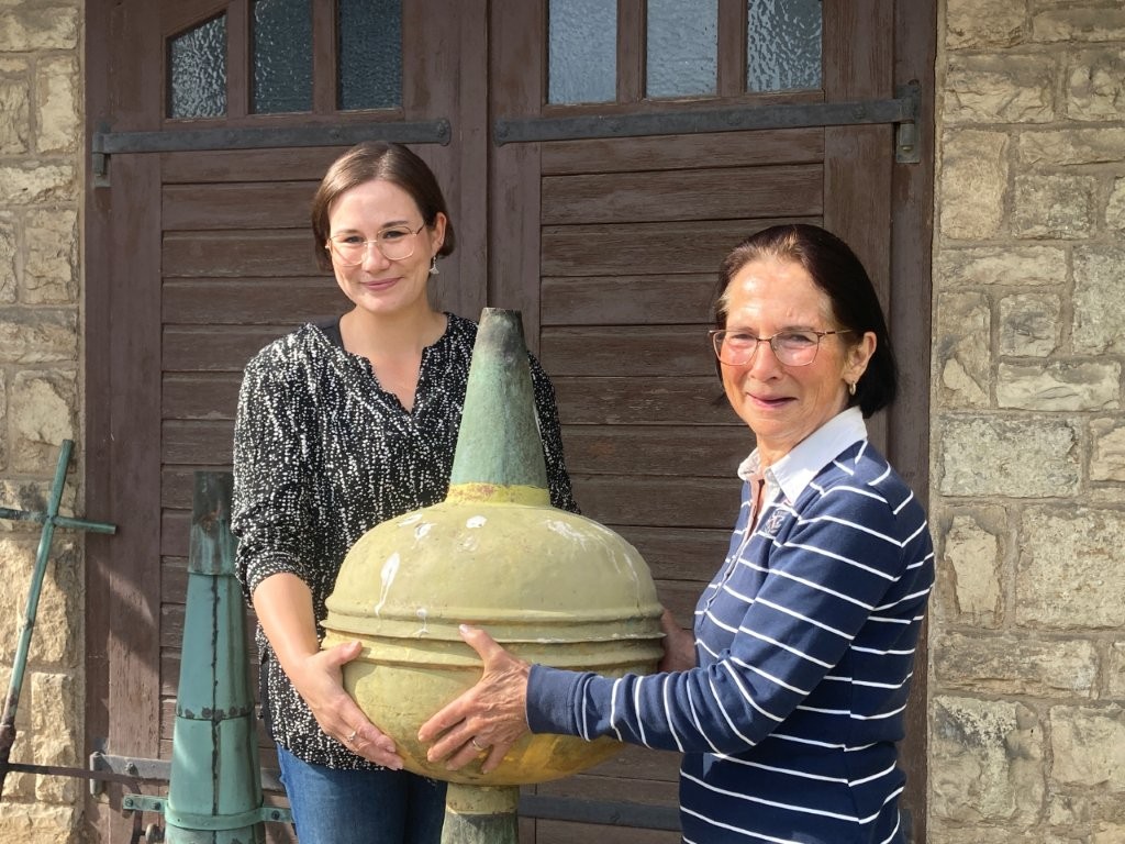 Schaft, Turmknopf sowie Wetterfahne mit Kreuz werden zur Reparatur abgenommen. GKR-Vorsitzende Gudrun Teubner (r.) mit Pfarrerin Julia Braband halten den Turmknopf.