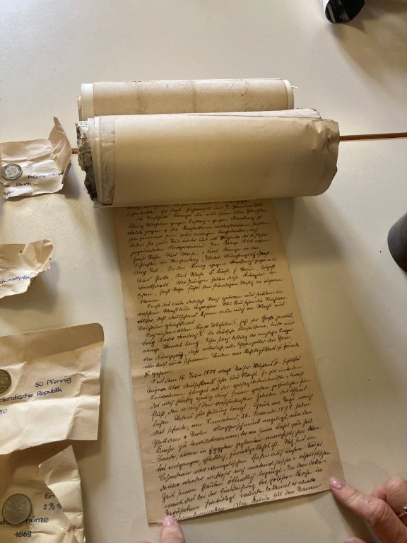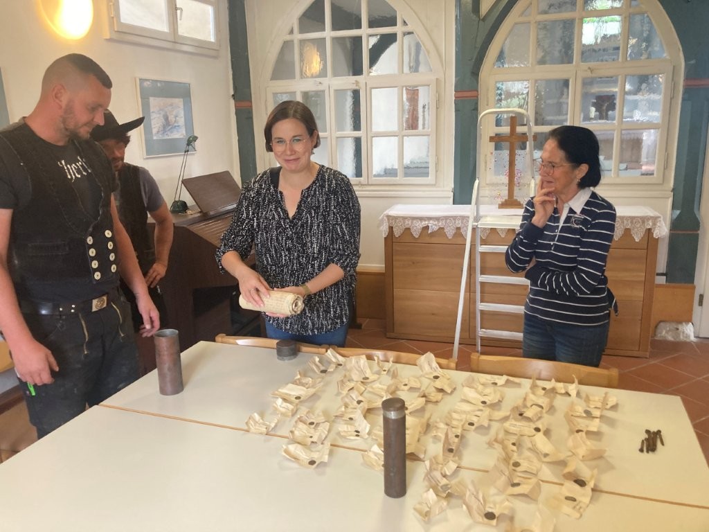 43 Jahre nach der letzten Öffnung entleeren am 9. September 2025 GKR-Vorsitzende Gudrun Teubner (r.) und Pfarrerin Julia Braband den Turmknopf. Zum Vorschein kommen eine kleine Kupferhülse mit Geldstücken sowie eine größere Hülse mit Dokumenten.